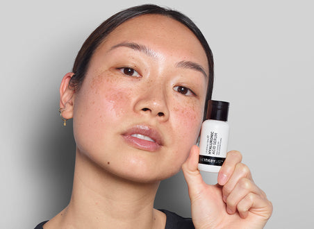 Next up, Hyaluronic Acid Serum is an essential step to follow up with for a deeper level of hydration that will keep dry areas in check. Once this is absorbed (wait 30-60 seconds), adding a layer of Niacinamide Serum to the oily areas can work wonders, as can an acid toner such as the Glycolic Acid Toner when used a couple of times a week.